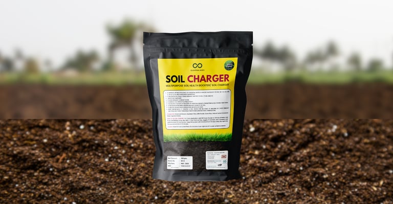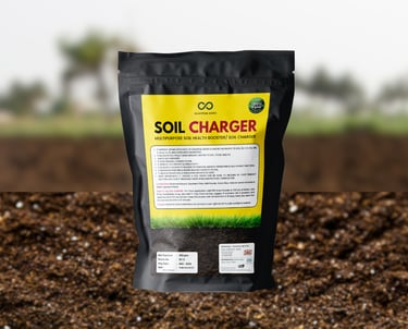 MULTIPURPOSE SOIL HEALTH BOOSTER/ SOIL CHARGER Soil Charger is a one-of-its-kind organic soil revival input developed through intensive R&D to meet the growing need for sustainable soil management. Formulated with a powerful blend of unique herbs and botanical extracts, it is designed to rejuvenate all types of soils—including dead, saline, and alkaline soils—by restoring fertility, boosting microbial life, and enhancing nutrient availability.