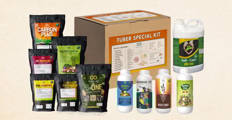 Embrace sustainable tuber crop farming with our newly researched and developed Tuber Special Kit, formulated exclusively for onion, garlic, ginger, and turmeric. This organic input kit is designed to improve soil health, enhance crop development, and support the overall productivity of tuber crops. By using the Tuber Special Kit, farmers can reduce their dependency on chemical fertilizers, lower input costs, and boost yields by up to 20% to 25%. It enriches the soil with organic matter and beneficial microbes, promoting stronger root development and healthier crop growth. Ideal for sustainable and cost-effective farming, the Tuber Special Kit is your complete solution for achieving higher-quality tuber harvests.